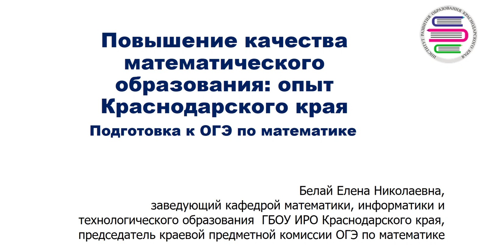 1. «Повышение качества математического образования: опыт Краснодарского края» - Белай Елена Николаевна, заведующая кафедрой математики, информатики и технологического образования ГБОУ ИРО Краснодарского края
