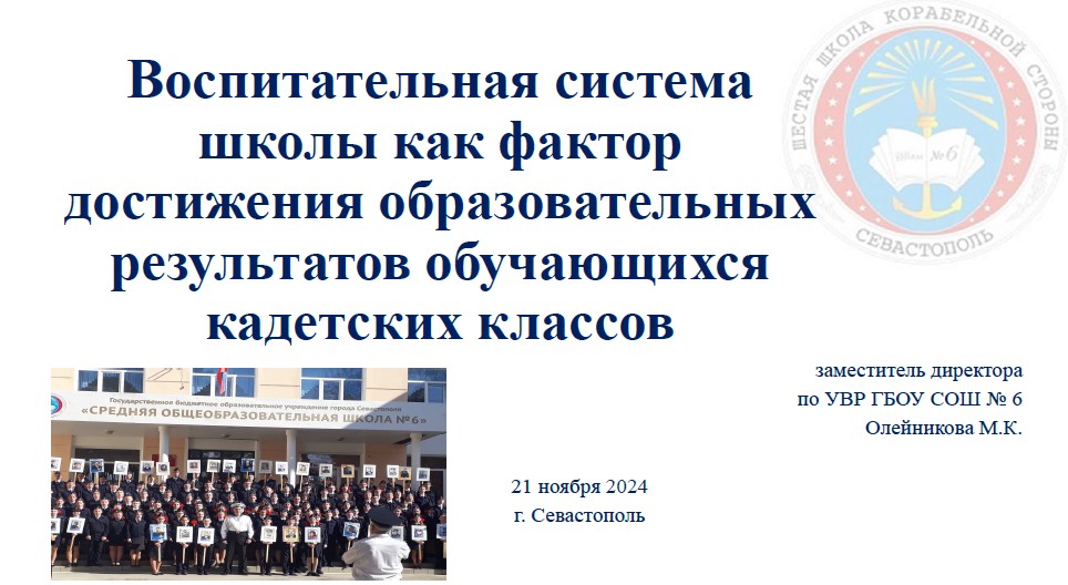 «Воспитательная система школы как фактор достижения образовательных результатов обучающихся кадетских классов» - Олейникова Мария Константиновна, заместитель директора по УВР ГБОУ СОШ № 6