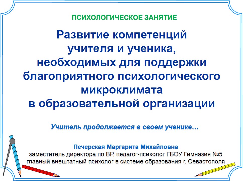 «Ролевые модели поведения учителя и ученика в поддержке психологического климата образовательных отношений» - Печерская Маргарита Михайловна, педагог-психолог ГБОУ Гимназия №5, главный внештатный психолог в системе образования города Севастополя