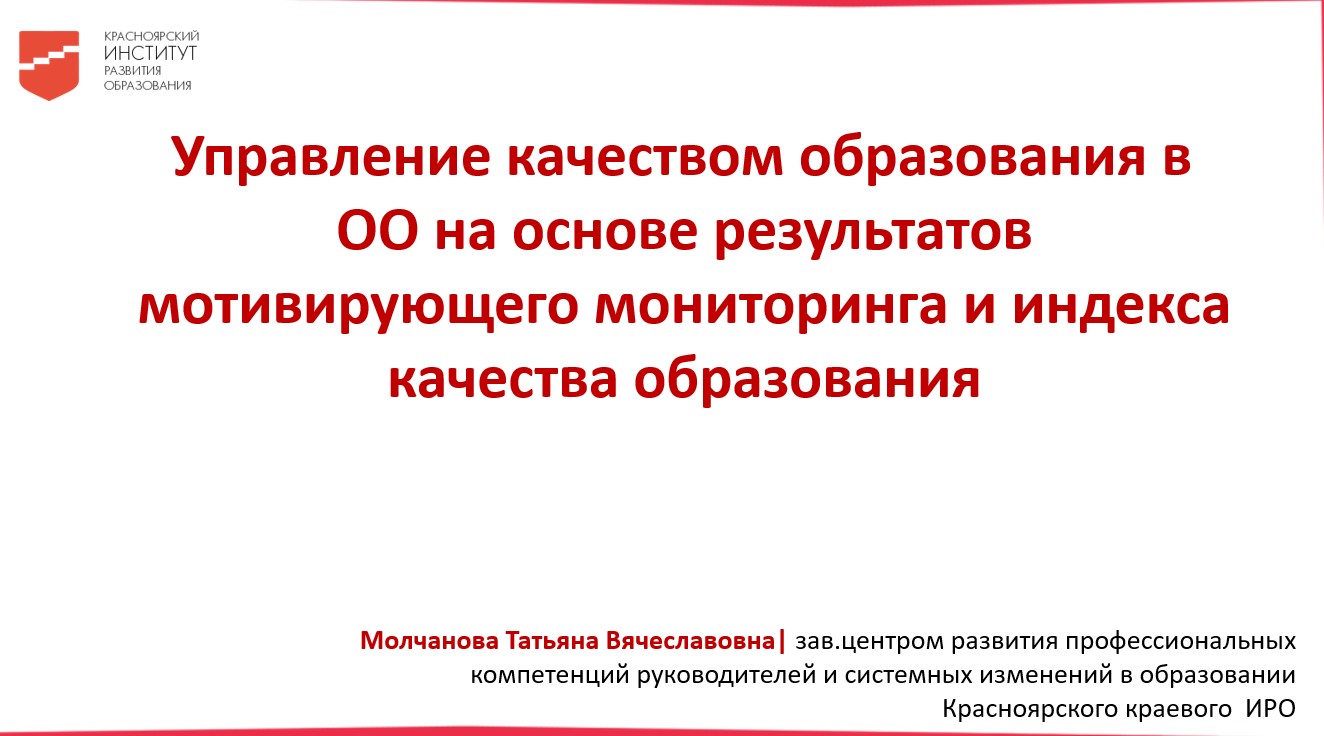 «Управление качеством образования в образовательной организации на основе результатов мотивирующего мониторинга и индекса качества образования» - Молчанова Татьяна Вячеславовна, заведующий центром развития профессиональных компетенций руководителей и системных изменений в образовании КГАУ ДПО КК ИРО