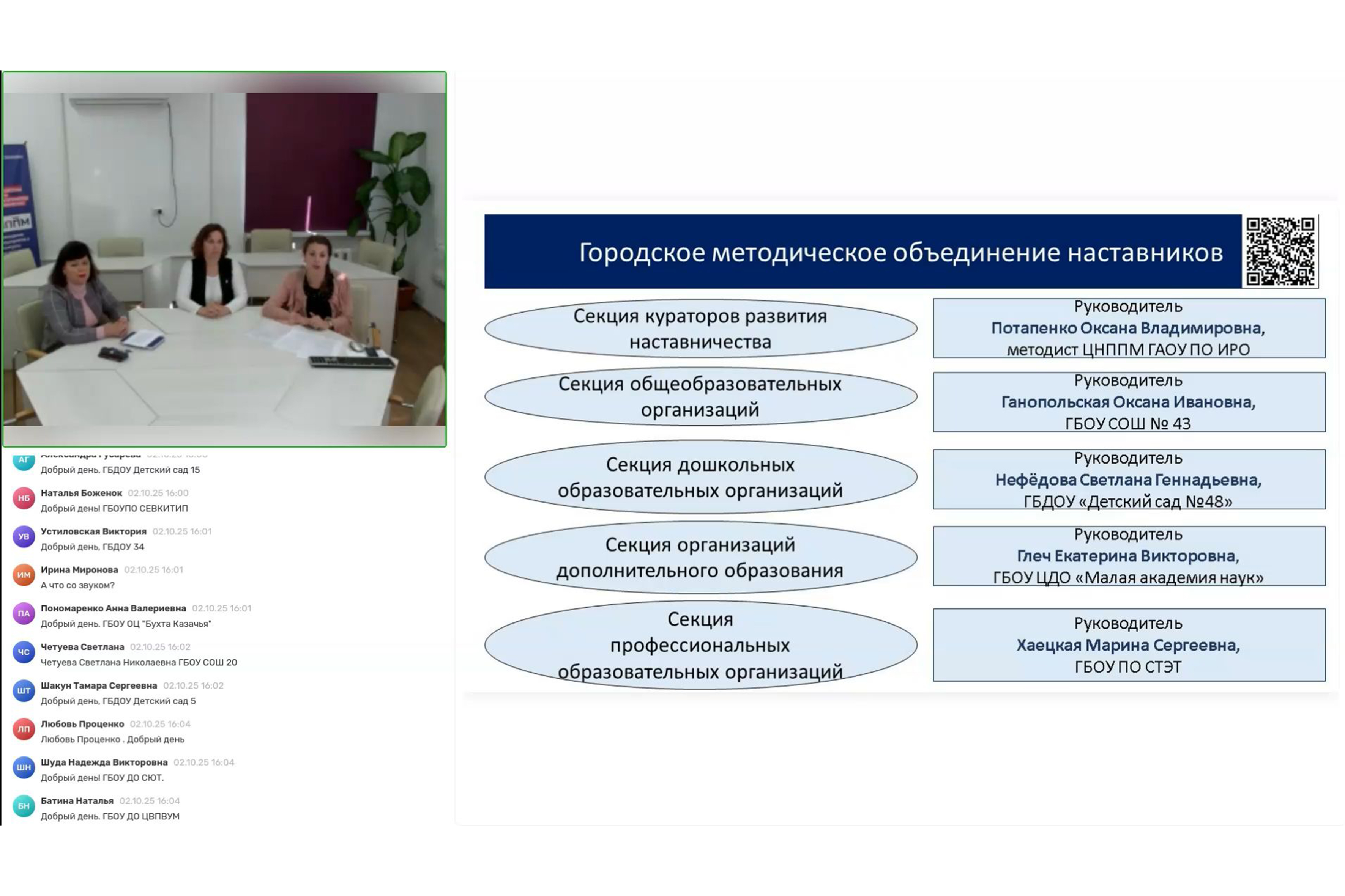 В первом онлайн-заседании, которое состоялось 2 октября, приняли участие 83 наставника. Заседание было посвящено актуальным направлениям работы городского методического объединения наставников в текущем учебном году.