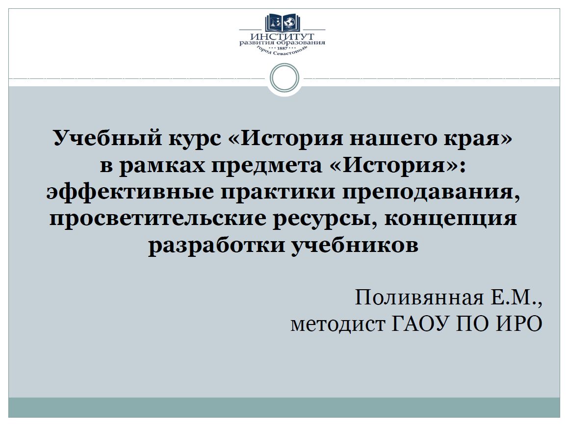 Учебный курс «История нашего края» в рамках предмета «История»: эффективные практики преподавания, просветительские ресурсы, концепция разработки учебников - Поливянная Екатерина Михайловна (г.Севастополь)
